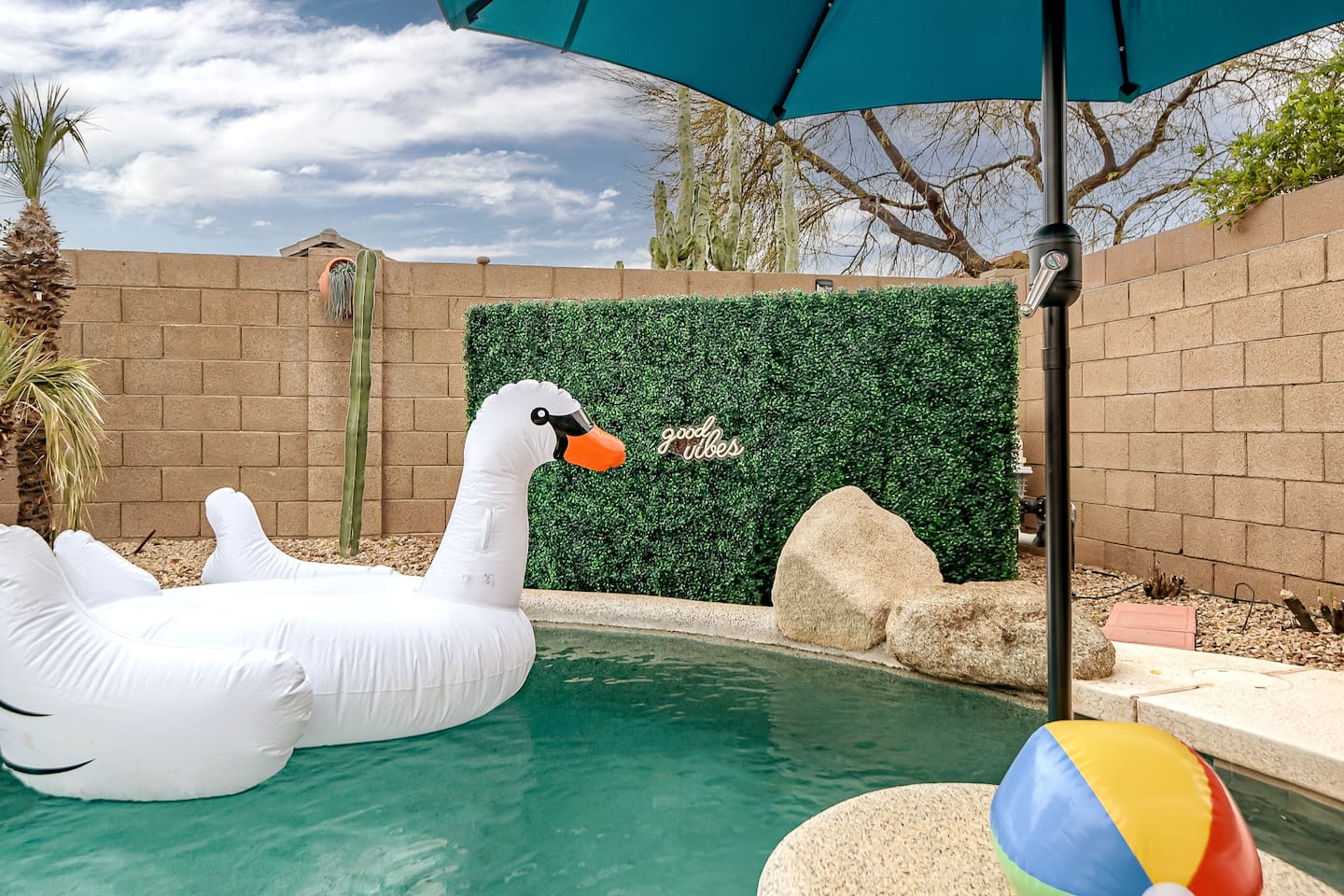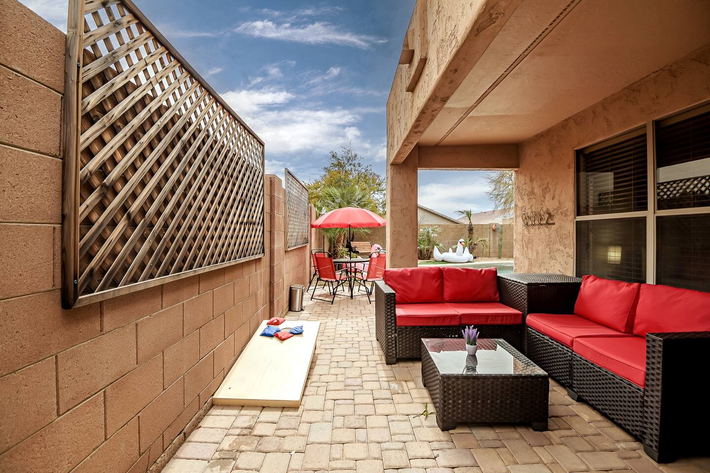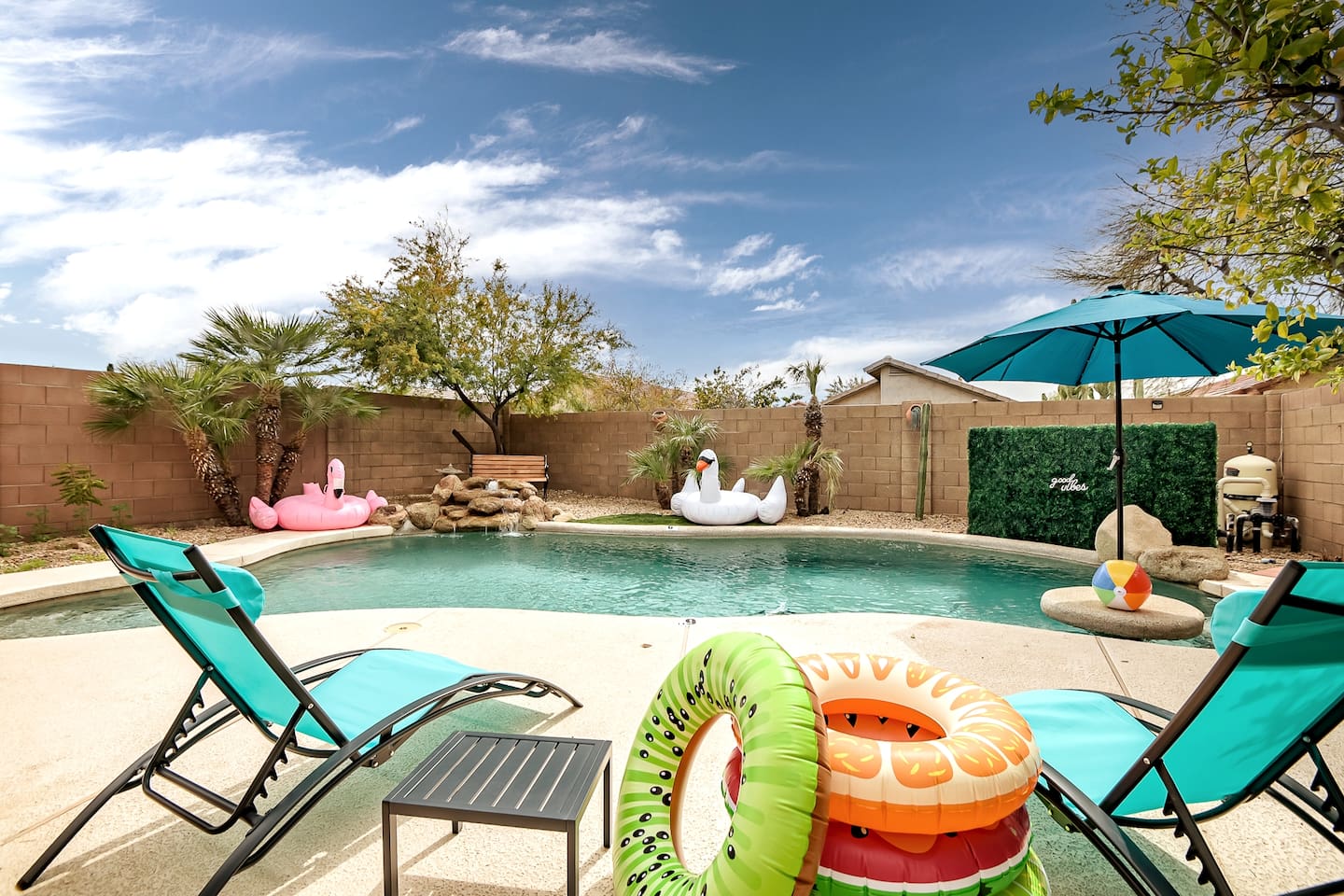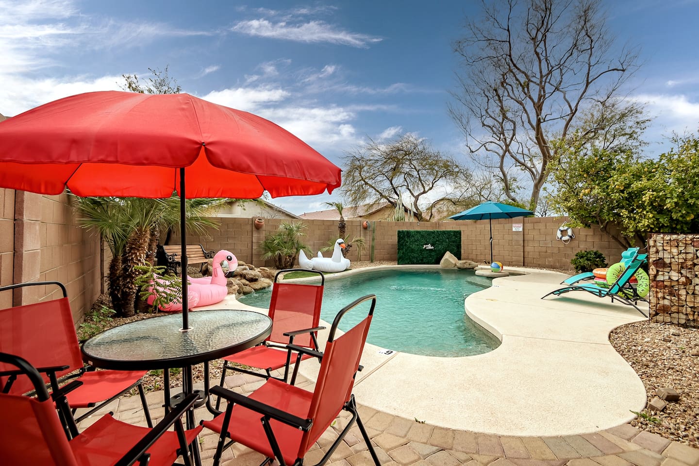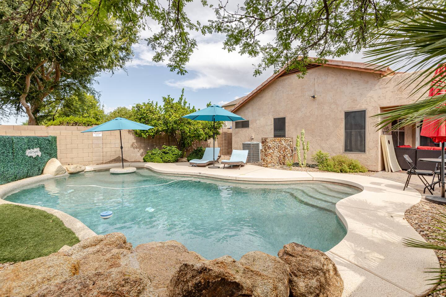 Welcome to your desert getaway! Step inside this bright and airy single-level home, where vaulted ceilings and contemporary décor create a cozy atmosphere. The main living area is the heart of the home, perfect for gathering for movie nights on the 55” Smart TV or enjoying a fun round of karaoke. This flexible space also includes two sofa beds and a futon for little ones. Your fully equipped kitchen features modern appliances and everything you need to prepare delicious home-cooked meals. Share dinner together at the dining table for six, or enjoy a casual bite at the kitchen bar. When it's time to rest, four calming bedrooms await, each styled with a plush queen bed and a smart TV. The master suite offers added privacy with its own en-suite bathroom featuring a modern walk-in shower. Step outside to discover your private, resort-like backyard. Make a splash in the heated pool, grill up a feast on the patio, or challengeWelcome to your desert getaway! Step inside this bright and airy single-level home, where vaulted ceilings and contemporary décor create an inviting atmosphere. The main living area is the heart of the home, perfect for gathering for movie nights or a fun round of karaoke. The 55” Smart TV is ready for entertainment with Netflix, Amazon Prime Video, HBO Max, Hulu, Disney+, and Apple TV. This flexible space also includes two sofa beds and a futon for additional sleeping options. Your fully equipped kitchen features modern black appliances, wood cabinets, and everything you need to prepare delicious home-cooked meals. Share dinner together at the dining table for six, or enjoy a casual bite at the kitchen bar. When it's time to rest, four calming bedrooms await, each styled with a plush queen bed and a smart TV. The master suite offers added privacy with its own en-suite bathroom featuring a modern walk-in shower with a pebble floor. The other bedrooms share a pristine bathroom with a shower-tub combination. Step outside to discover your private, resort-like backyard. This fully fenced space is perfect for peace of mind. Make a splash in the heated pool, grill up a feast on the patio, or challenge friends to a game of Cornhole. As the sun sets, unwind in a lounge chair and enjoy the peaceful Arizona sky. We've thoughtfully included amenities for every traveler: - For Families: A crib, high chair, children's dinnerware, and board games are available. - For Remote Work: Stay connected with high-speed WiFi and a dedicated workspace. - Pet-Friendly: We are happy to welcome your furry friends to our home.