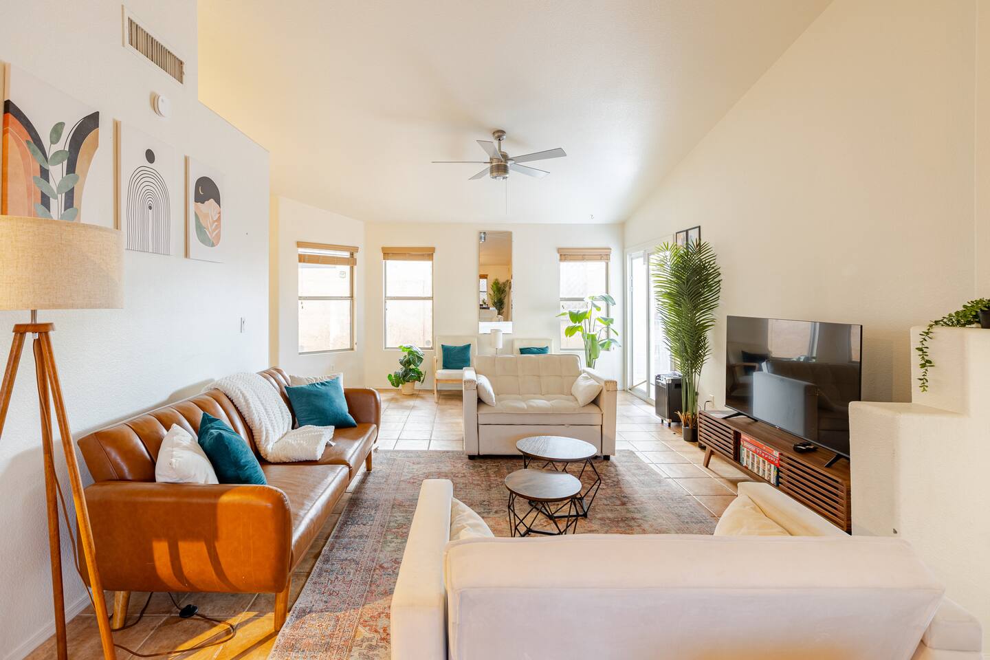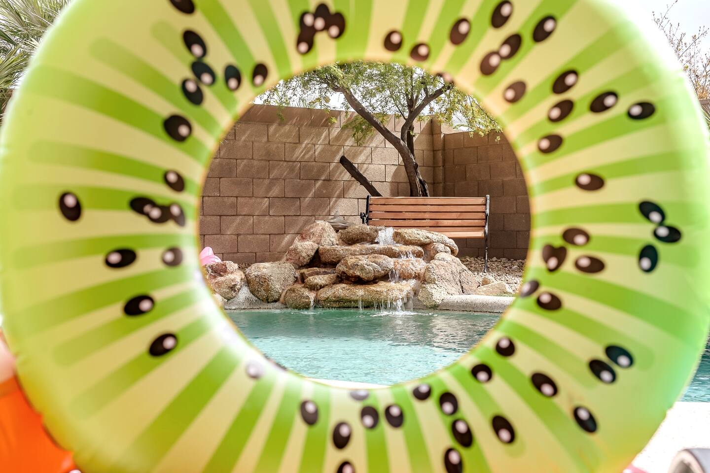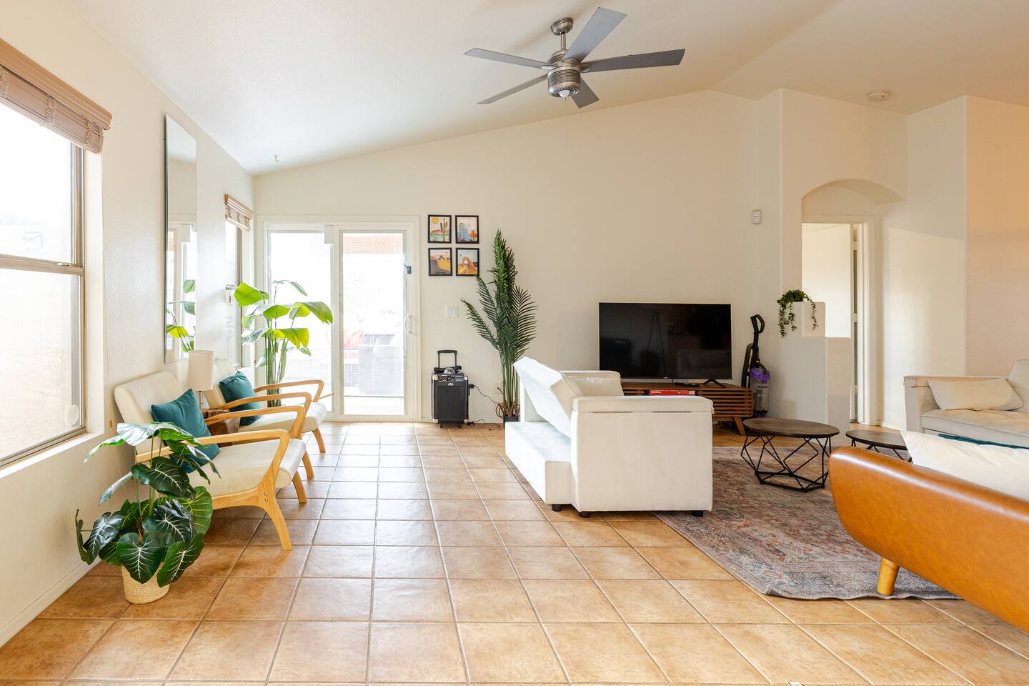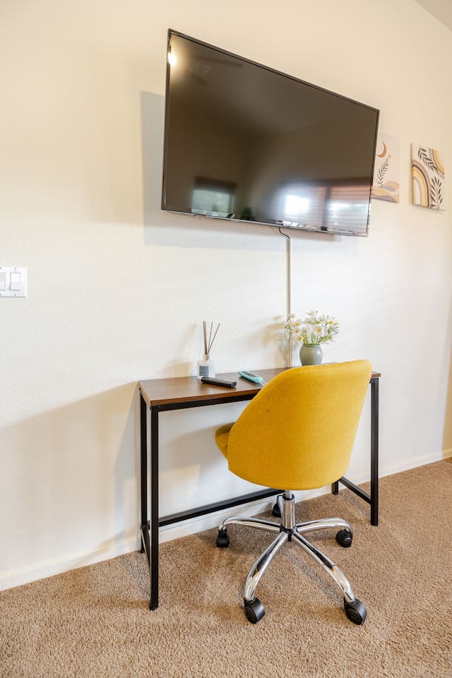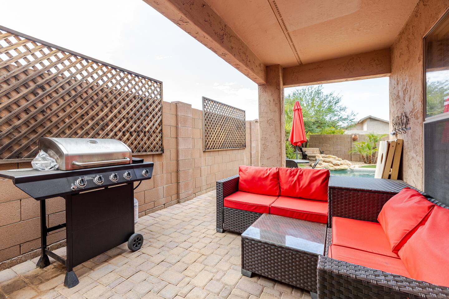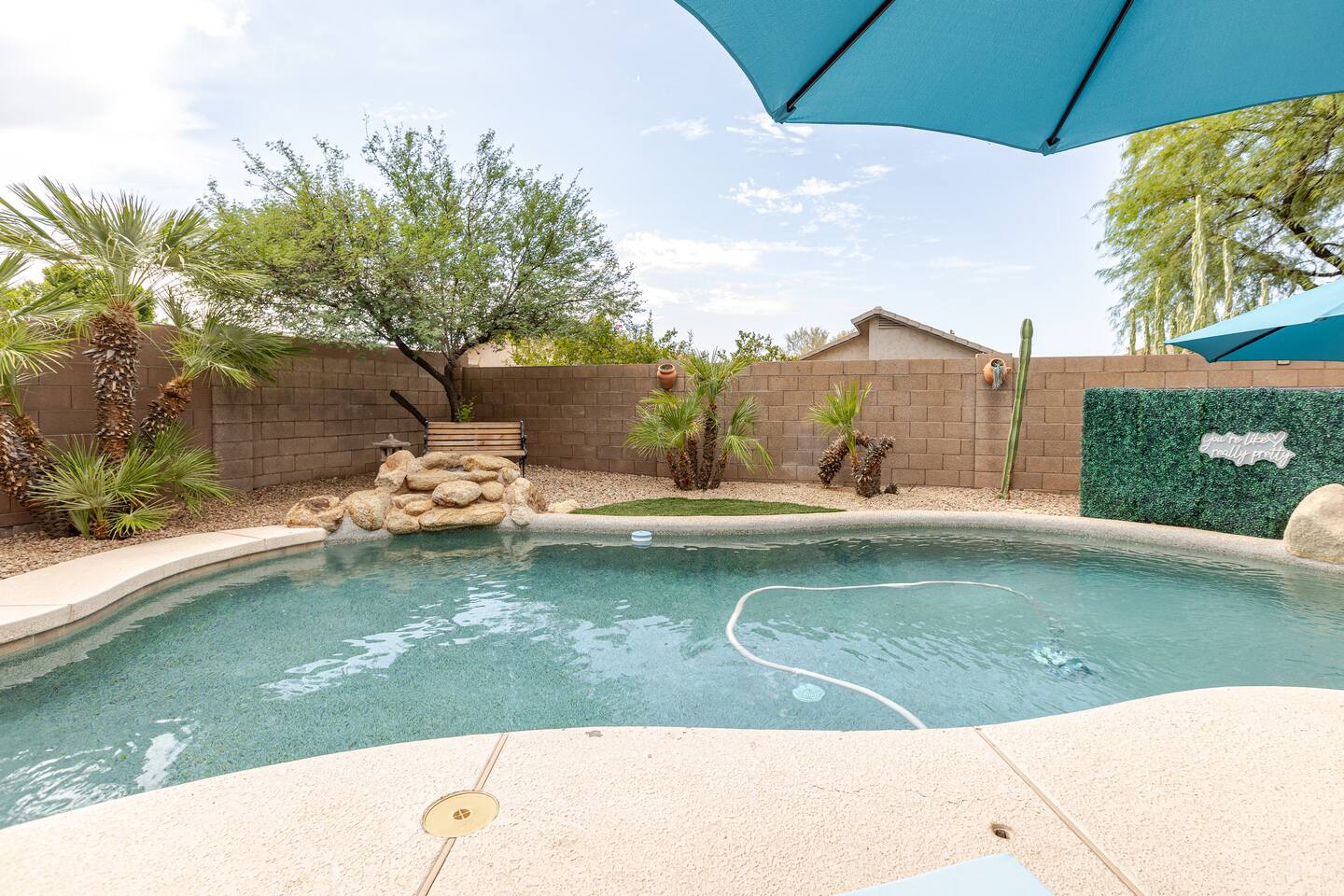 Welcome to your desert getaway! Step inside this bright and airy single-level home, where vaulted ceilings and contemporary décor create a cozy atmosphere. The main living area is the heart of the home, perfect for gathering for movie nights on the 55” Smart TV or enjoying a fun round of karaoke. This flexible space also includes two sofa beds and a futon for little ones. Your fully equipped kitchen features modern appliances and everything you need to prepare delicious home-cooked meals. Share dinner together at the dining table for six, or enjoy a casual bite at the kitchen bar. When it's time to rest, four calming bedrooms await, each styled with a plush queen bed and a smart TV. The master suite offers added privacy with its own en-suite bathroom featuring a modern walk-in shower. Step outside to discover your private, resort-like backyard. Make a splash in the heated pool, grill up a feast on the patio, or challengeWelcome to your desert getaway! Step inside this bright and airy single-level home, where vaulted ceilings and contemporary décor create an inviting atmosphere. The main living area is the heart of the home, perfect for gathering for movie nights or a fun round of karaoke. The 55” Smart TV is ready for entertainment with Netflix, Amazon Prime Video, HBO Max, Hulu, Disney+, and Apple TV. This flexible space also includes two sofa beds and a futon for additional sleeping options. Your fully equipped kitchen features modern black appliances, wood cabinets, and everything you need to prepare delicious home-cooked meals. Share dinner together at the dining table for six, or enjoy a casual bite at the kitchen bar. When it's time to rest, four calming bedrooms await, each styled with a plush queen bed and a smart TV. The master suite offers added privacy with its own en-suite bathroom featuring a modern walk-in shower with a pebble floor. The other bedrooms share a pristine bathroom with a shower-tub combination. Step outside to discover your private, resort-like backyard. This fully fenced space is perfect for peace of mind. Make a splash in the heated pool, grill up a feast on the patio, or challenge friends to a game of Cornhole. As the sun sets, unwind in a lounge chair and enjoy the peaceful Arizona sky. We've thoughtfully included amenities for every traveler: - For Families: A crib, high chair, children's dinnerware, and board games are available. - For Remote Work: Stay connected with high-speed WiFi and a dedicated workspace. - Pet-Friendly: We are happy to welcome your furry friends to our home.