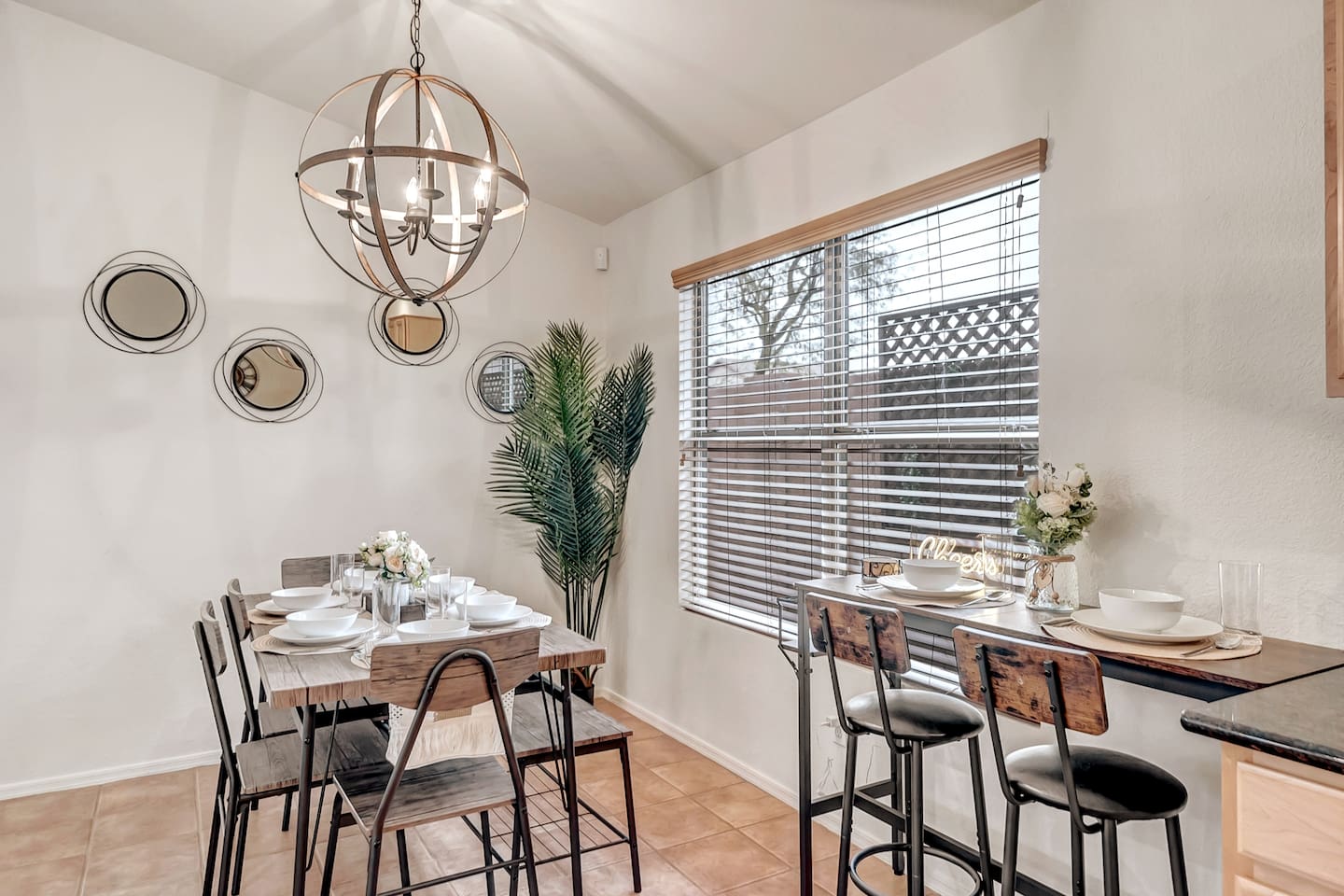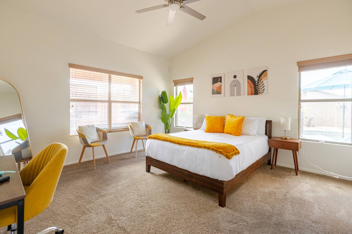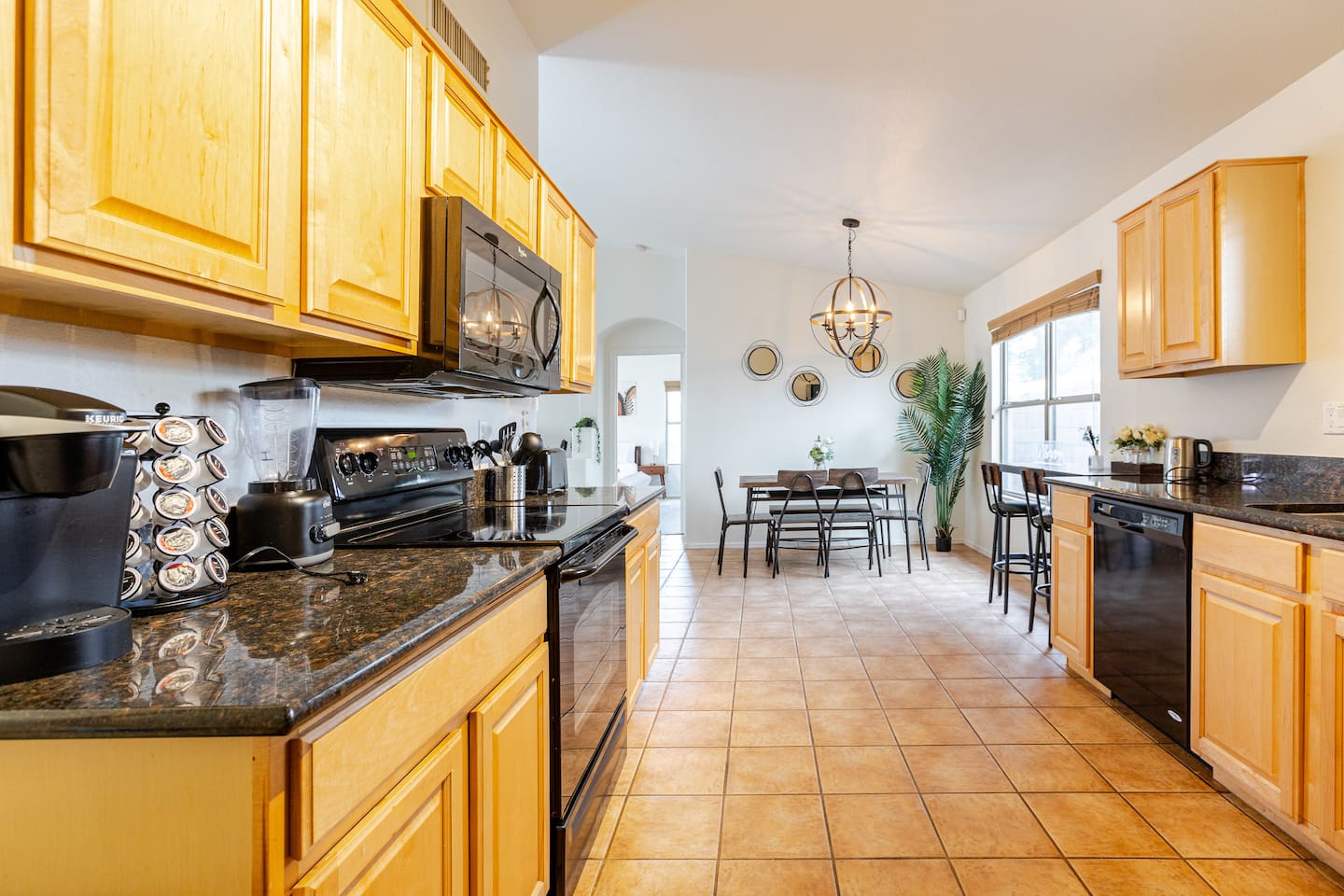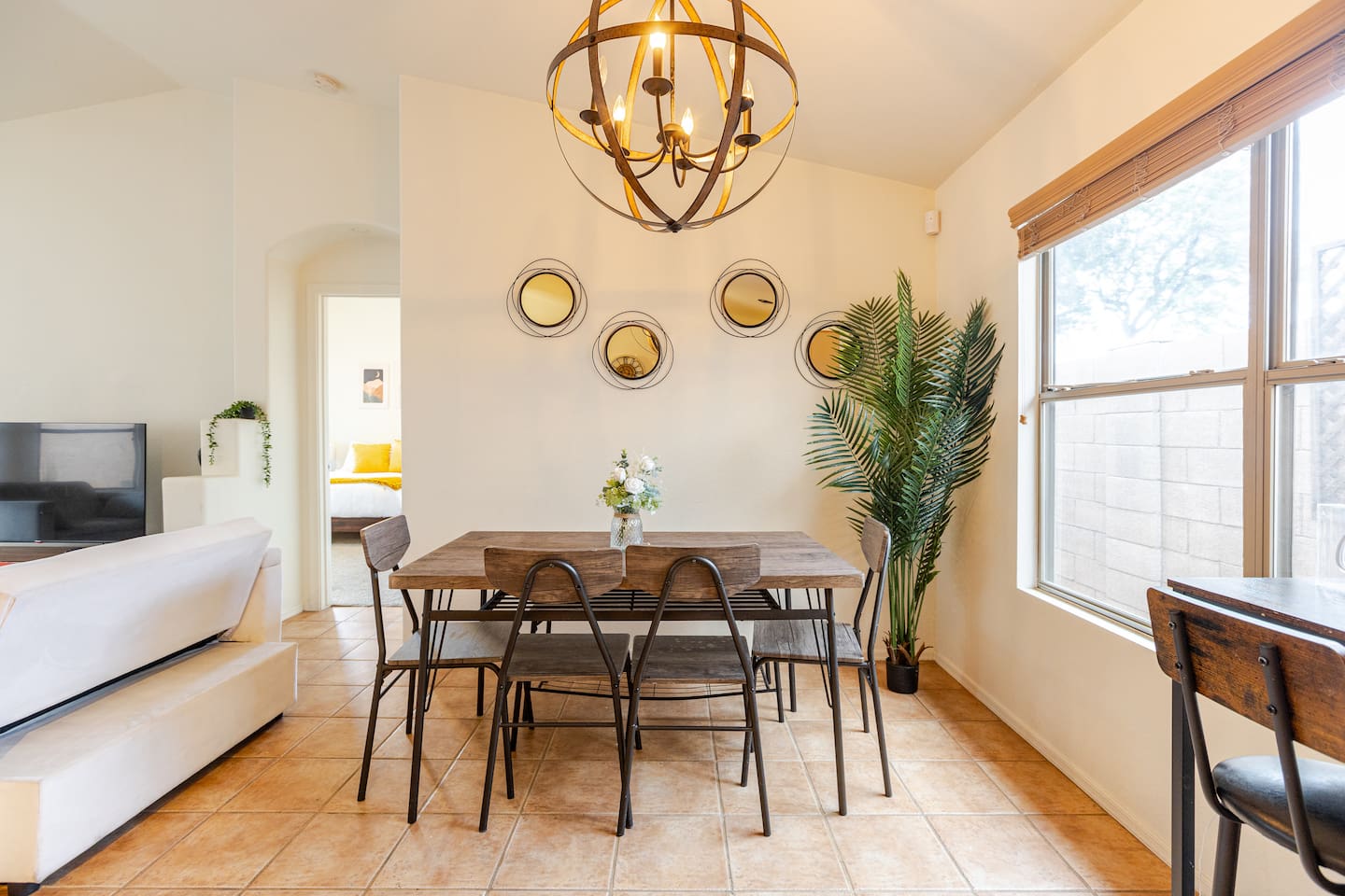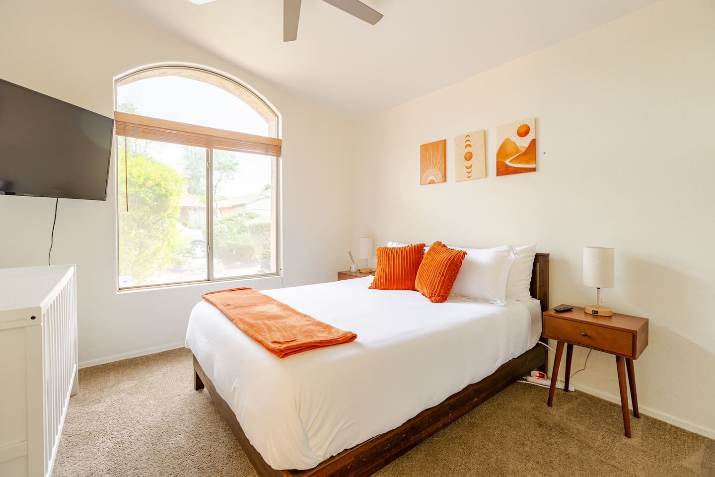 Welcome to your desert getaway! Step inside this bright and airy single-level home, where vaulted ceilings and contemporary décor create a cozy atmosphere. The main living area is the heart of the home, perfect for gathering for movie nights on the 55” Smart TV or enjoying a fun round of karaoke. This flexible space also includes two sofa beds and a futon for little ones. Your fully equipped kitchen features modern appliances and everything you need to prepare delicious home-cooked meals. Share dinner together at the dining table for six, or enjoy a casual bite at the kitchen bar. When it's time to rest, four calming bedrooms await, each styled with a plush queen bed and a smart TV. The master suite offers added privacy with its own en-suite bathroom featuring a modern walk-in shower. Step outside to discover your private, resort-like backyard. Make a splash in the heated pool, grill up a feast on the patio, or challengeWelcome to your desert getaway! Step inside this bright and airy single-level home, where vaulted ceilings and contemporary décor create an inviting atmosphere. The main living area is the heart of the home, perfect for gathering for movie nights or a fun round of karaoke. The 55” Smart TV is ready for entertainment with Netflix, Amazon Prime Video, HBO Max, Hulu, Disney+, and Apple TV. This flexible space also includes two sofa beds and a futon for additional sleeping options. Your fully equipped kitchen features modern black appliances, wood cabinets, and everything you need to prepare delicious home-cooked meals. Share dinner together at the dining table for six, or enjoy a casual bite at the kitchen bar. When it's time to rest, four calming bedrooms await, each styled with a plush queen bed and a smart TV. The master suite offers added privacy with its own en-suite bathroom featuring a modern walk-in shower with a pebble floor. The other bedrooms share a pristine bathroom with a shower-tub combination. Step outside to discover your private, resort-like backyard. This fully fenced space is perfect for peace of mind. Make a splash in the heated pool, grill up a feast on the patio, or challenge friends to a game of Cornhole. As the sun sets, unwind in a lounge chair and enjoy the peaceful Arizona sky. We've thoughtfully included amenities for every traveler: - For Families: A crib, high chair, children's dinnerware, and board games are available. - For Remote Work: Stay connected with high-speed WiFi and a dedicated workspace. - Pet-Friendly: We are happy to welcome your furry friends to our home.