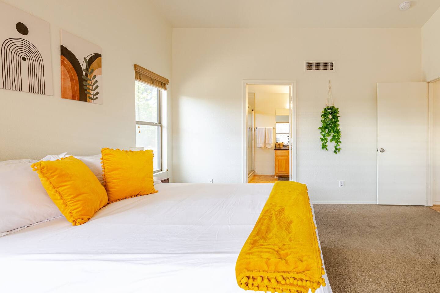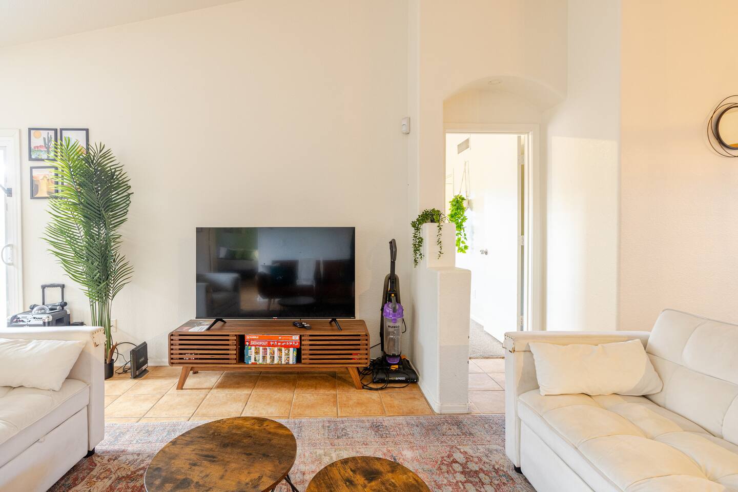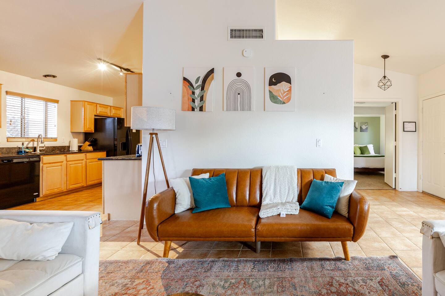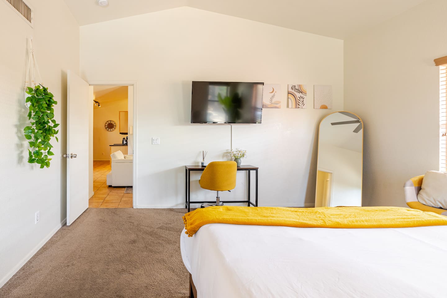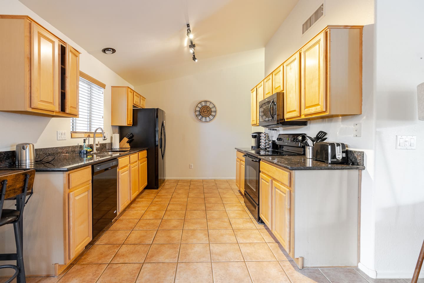 Welcome to your desert getaway! Step inside this bright and airy single-level home, where vaulted ceilings and contemporary décor create a cozy atmosphere. The main living area is the heart of the home, perfect for gathering for movie nights on the 55” Smart TV or enjoying a fun round of karaoke. This flexible space also includes two sofa beds and a futon for little ones. Your fully equipped kitchen features modern appliances and everything you need to prepare delicious home-cooked meals. Share dinner together at the dining table for six, or enjoy a casual bite at the kitchen bar. When it's time to rest, four calming bedrooms await, each styled with a plush queen bed and a smart TV. The master suite offers added privacy with its own en-suite bathroom featuring a modern walk-in shower. Step outside to discover your private, resort-like backyard. Make a splash in the heated pool, grill up a feast on the patio, or challengeWelcome to your desert getaway! Step inside this bright and airy single-level home, where vaulted ceilings and contemporary décor create an inviting atmosphere. The main living area is the heart of the home, perfect for gathering for movie nights or a fun round of karaoke. The 55” Smart TV is ready for entertainment with Netflix, Amazon Prime Video, HBO Max, Hulu, Disney+, and Apple TV. This flexible space also includes two sofa beds and a futon for additional sleeping options. Your fully equipped kitchen features modern black appliances, wood cabinets, and everything you need to prepare delicious home-cooked meals. Share dinner together at the dining table for six, or enjoy a casual bite at the kitchen bar. When it's time to rest, four calming bedrooms await, each styled with a plush queen bed and a smart TV. The master suite offers added privacy with its own en-suite bathroom featuring a modern walk-in shower with a pebble floor. The other bedrooms share a pristine bathroom with a shower-tub combination. Step outside to discover your private, resort-like backyard. This fully fenced space is perfect for peace of mind. Make a splash in the heated pool, grill up a feast on the patio, or challenge friends to a game of Cornhole. As the sun sets, unwind in a lounge chair and enjoy the peaceful Arizona sky. We've thoughtfully included amenities for every traveler: - For Families: A crib, high chair, children's dinnerware, and board games are available. - For Remote Work: Stay connected with high-speed WiFi and a dedicated workspace. - Pet-Friendly: We are happy to welcome your furry friends to our home.