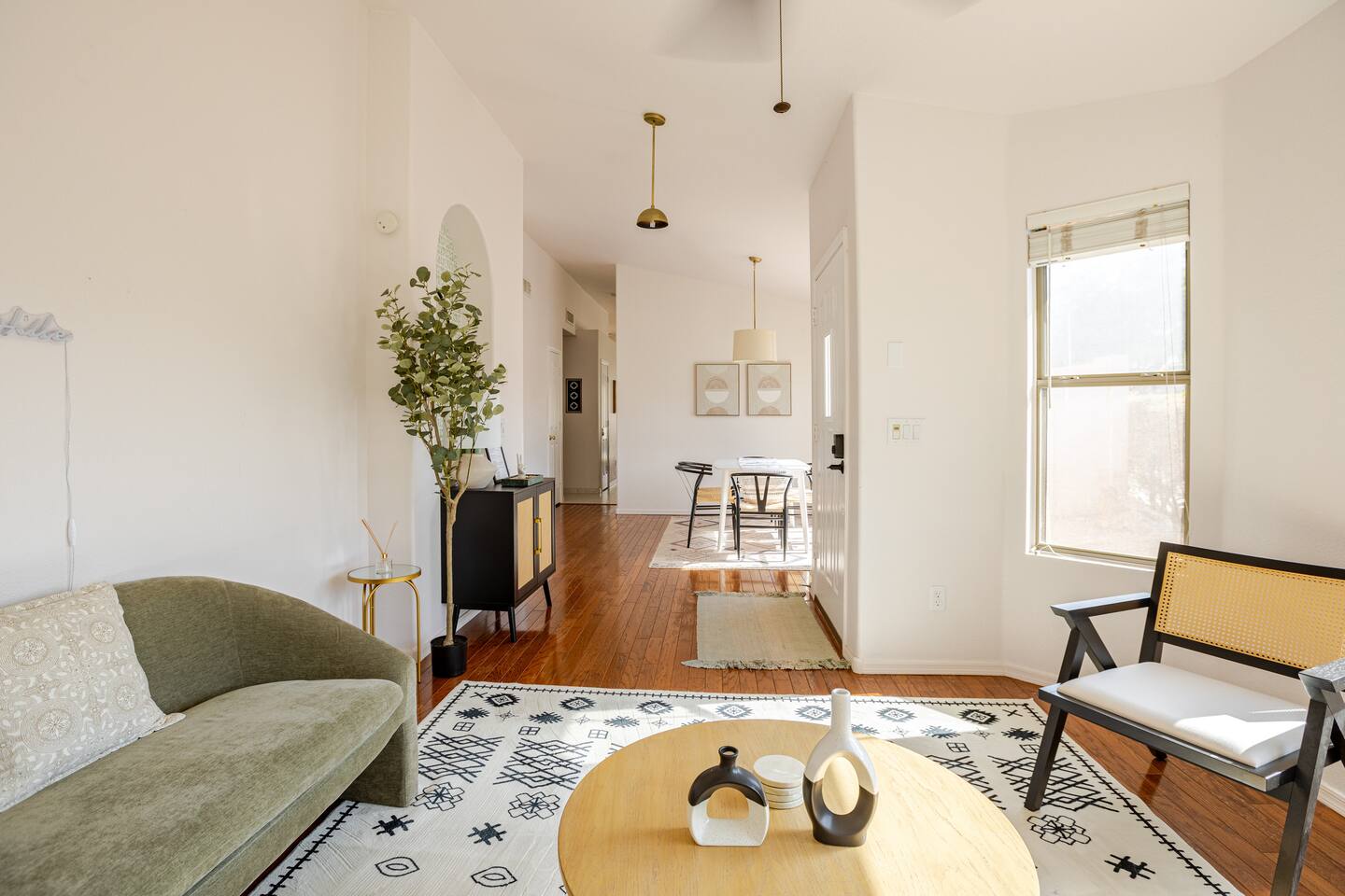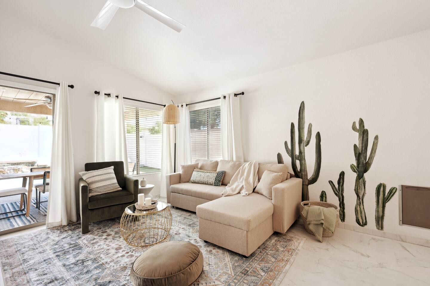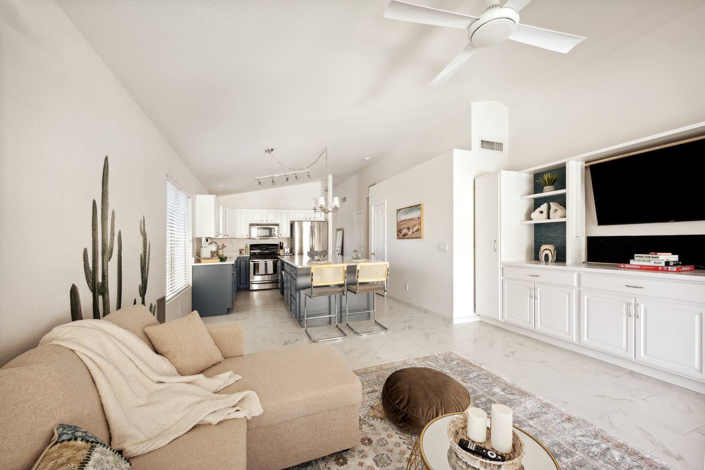 Step inside to a bright, airy open-plan living space with plenty of natural light. The spacious living room provides cozy seating and a smart TV, flowing seamlessly into a fully equipped kitchen. Gather around the large kitchen island for a casual breakfast or enjoy a group dinner at the dining table. After a day of exploring, it's the perfect spot for a movie night. This home accommodates your group across three bedrooms featuring plush bedding and its own smart TV. The master suite includes a private bathroom for added comfort, and a sofa bed in the living room provides extra flexibility. The two bathrooms are stocked with fluffy towels and complimentary toiletries to make your stay effortless. Your private backyard is a fun-filled retreat. Challenge friends to a round on the mini-golf course, cool off in the heated pool, or play one of the life-size games. As evening falls, gather around the fire pit to share stories under the stars. - Family-Friendly: We provide a high chair, pack 'n play, and board games for our younger guests. - Pet-Friendly: We are happy to welcome your furry friends to our home. - Work-From-Home Ready: A dedicated workspace and high-speed WiFi are available for your convenience.