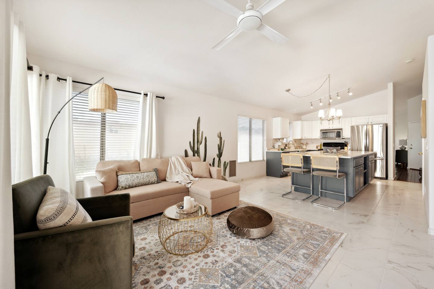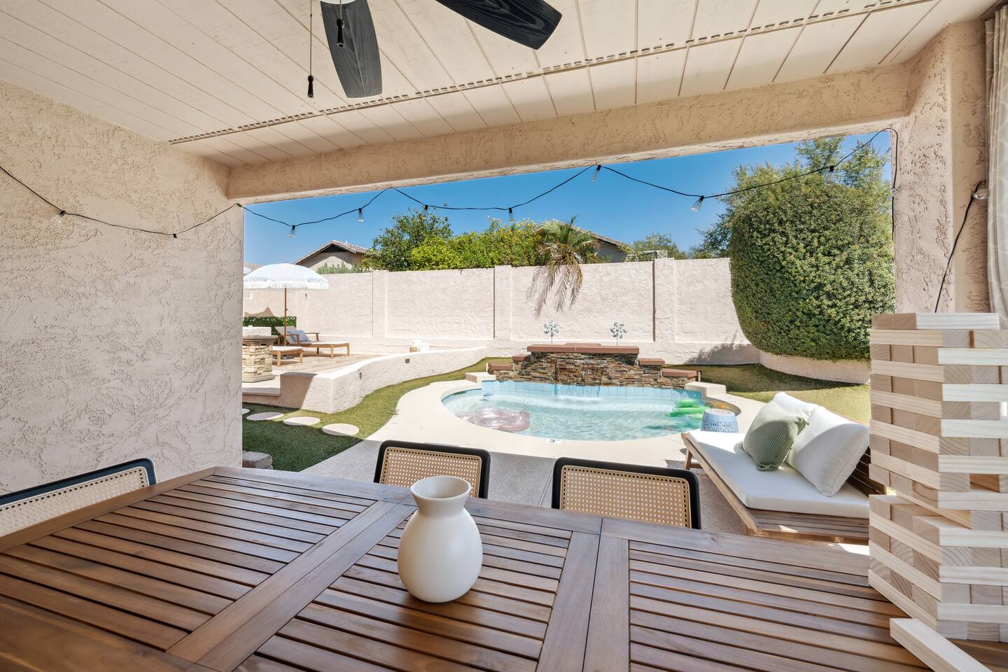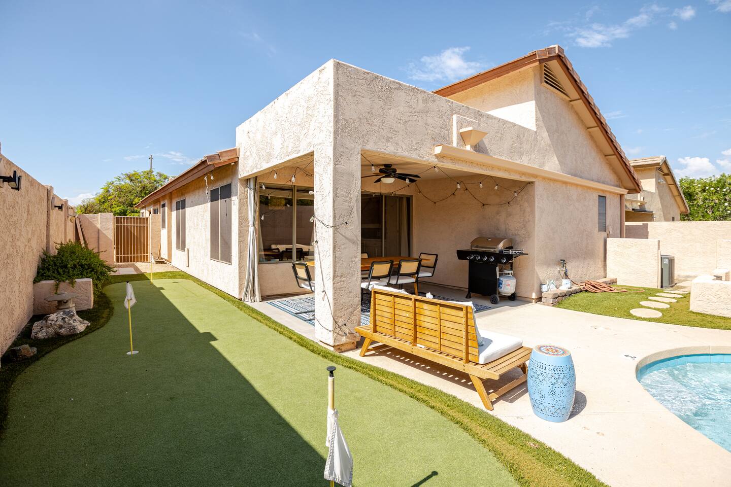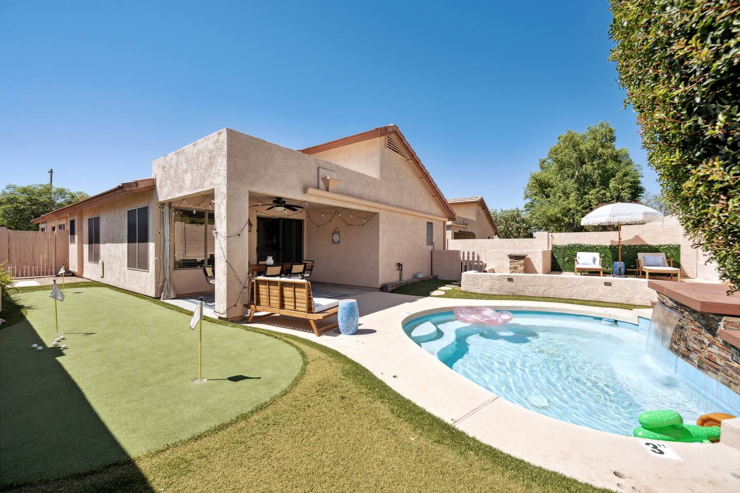 Relax at this 3BR Uptown Phoenix oasis with a heated pool, mini golf, and fire pit under the stars. Perfect for families, friends, or business trips. Enjoy open living spaces, a full kitchen, and fast WiFi. Just minutes to Desert Ridge Marketplace, JW Marriott, Mayo Clinic, top dining, golf, and hiking. The ideal spot to unwind, explore, and create memories in the heart of Phoenix.
